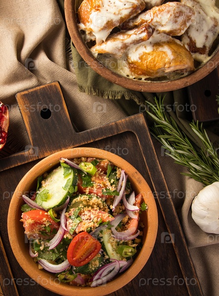 Вертикальный снимок курицы в сливочном соусе и салате из баклажанов