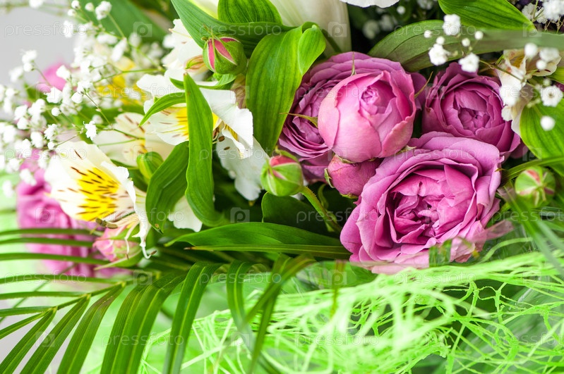 Крупный план красивых пионовидных роз, альстромерий и декоративной травы в букете