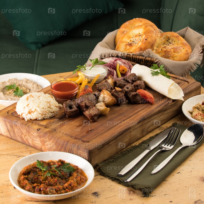Крупный план мясного кебаба возле корзины с хлебом