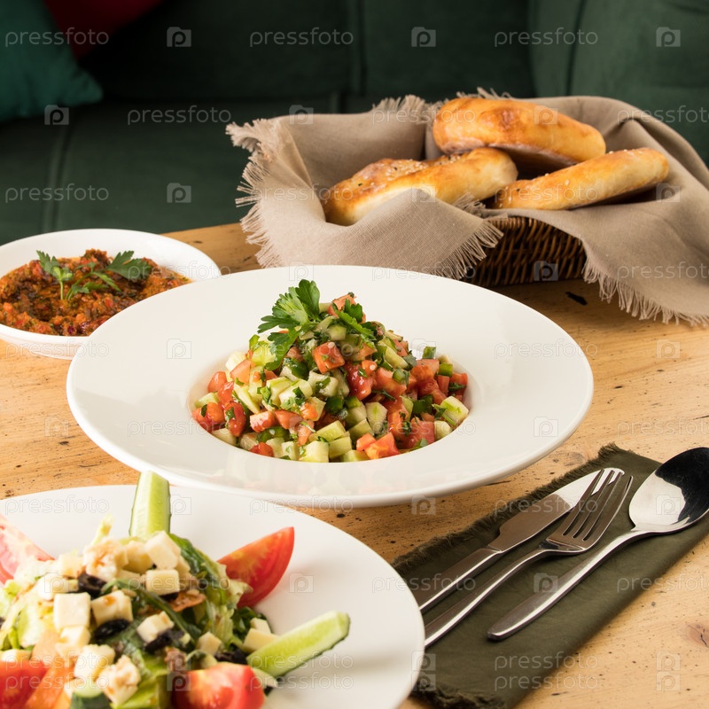 Крупный план салатов и закусок возле корзины с хлебом