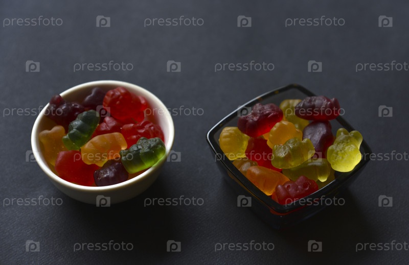 Желейные мармеладные мишки в керамической чашке на черном фоне. Мармелад красочные конфеты крупным планом