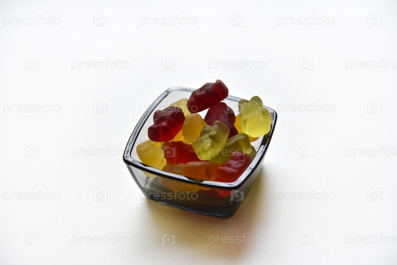 Вкусный мармелад желе несет конфеты в упаковке на белом фоне. Сладкая закуска в виде желейных красочных аппетитных животных