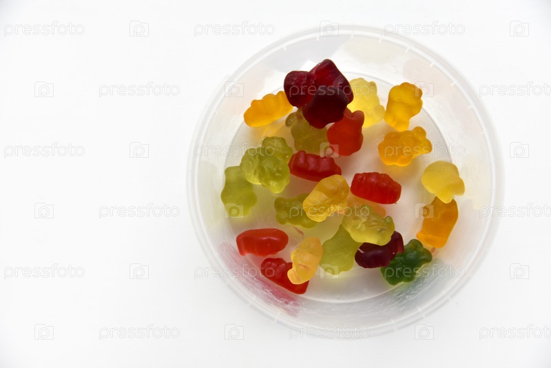 Вкусный мармелад желе несет конфеты в упаковке на белом фоне. Сладкая закуска в виде желейных красочных аппетитных животных