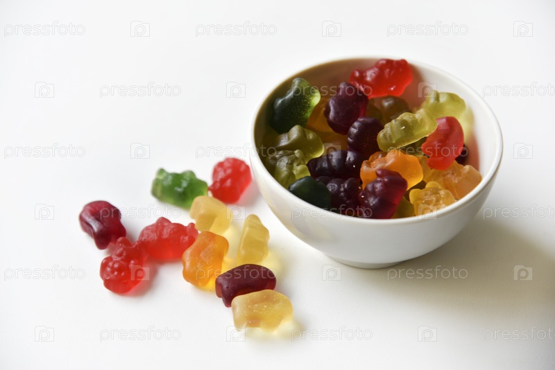 Вкусный мармелад желе несет конфеты в упаковке на белом фоне. Сладкая закуска в виде желейных красочных аппетитных животных