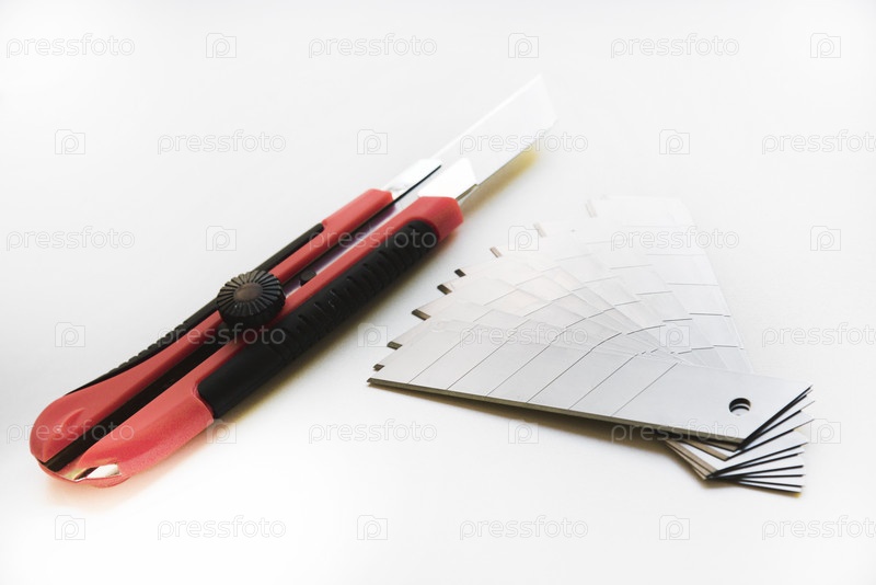 Красный канцелярский нож с лезвиями на белом фоне. Режущий инструмент с лезвиями на белом фоне
