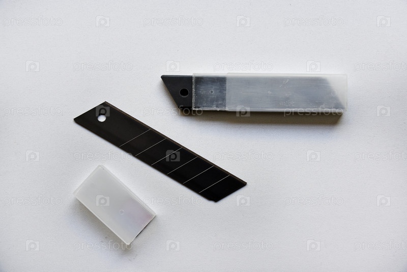 Красный канцелярский нож с лезвиями на белом фоне. Режущий инструмент с лезвиями на белом фоне