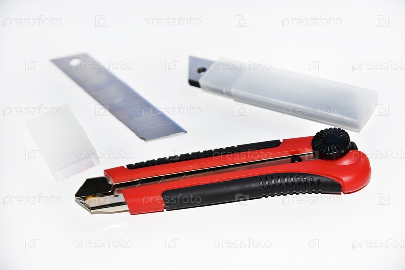 Красный канцелярский нож с лезвиями на белом фоне. Режущий инструмент с лезвиями на белом фоне