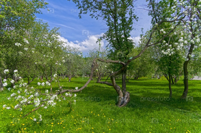 Цветет старая яблоня с причудливо изогнутым и перекрученным стволом. Яблоневый сад в Коньково, Юго-Западный административный округ Москвы, солнечный день в мае