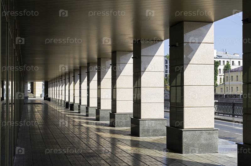 Длинный проход с колоннами. Офисное здание на Овчинниковской набережной, Замоскворечье, Москва