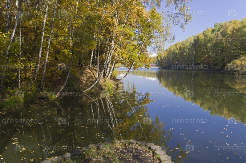 Красивый осенний пейзаж - деревья с желтой осенней листвой на берегу пруда. Теплостановский лесопарк, Москва. Солнечный день в октябре