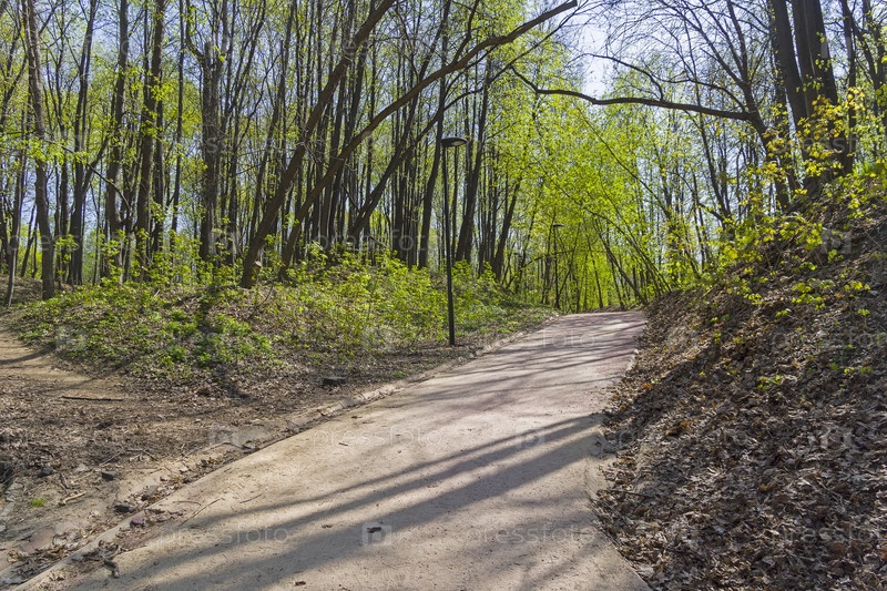 Пустая аллея в парке в солнечный день. Нескучный Сад, Москва, Россия, начало мая