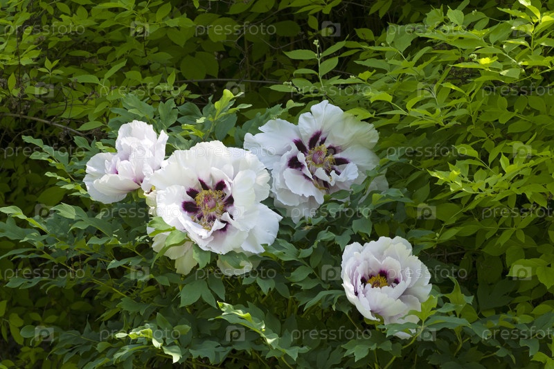 Цветущие белые древовидные пионы. Солнечный день в конце мая. Аптекарский Огород (филиал ботанического сада МГУ), Москва