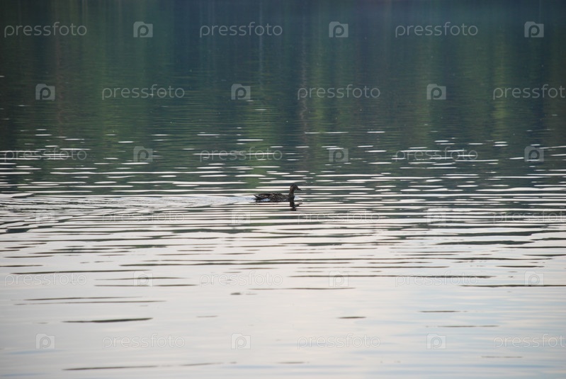 Утка плывет по лесному озеру