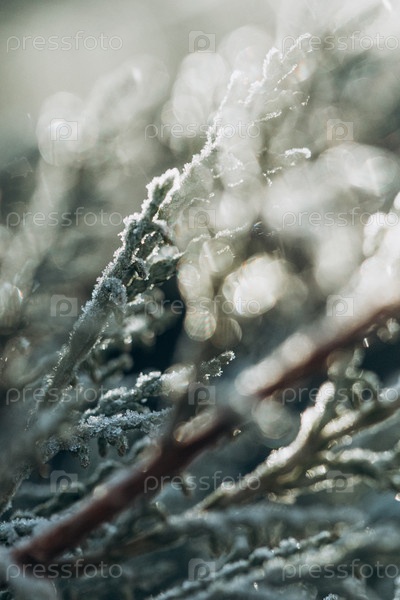Абстрактный фон из травы, покрытой инеем/ ветка можжевельника покрытые инеем, первым снегом. Осенние заморозки