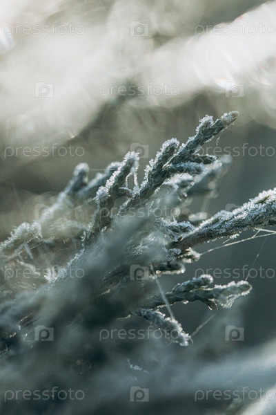 Абстрактный фон из травы, покрытой инеем/ ветка можжевельника покрытые инеем, первым снегом. Осенние заморозки
