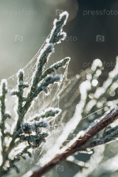 Абстрактный фон из травы, покрытой инеем/ ветка можжевельника покрытые инеем, первым снегом. Осенние заморозки