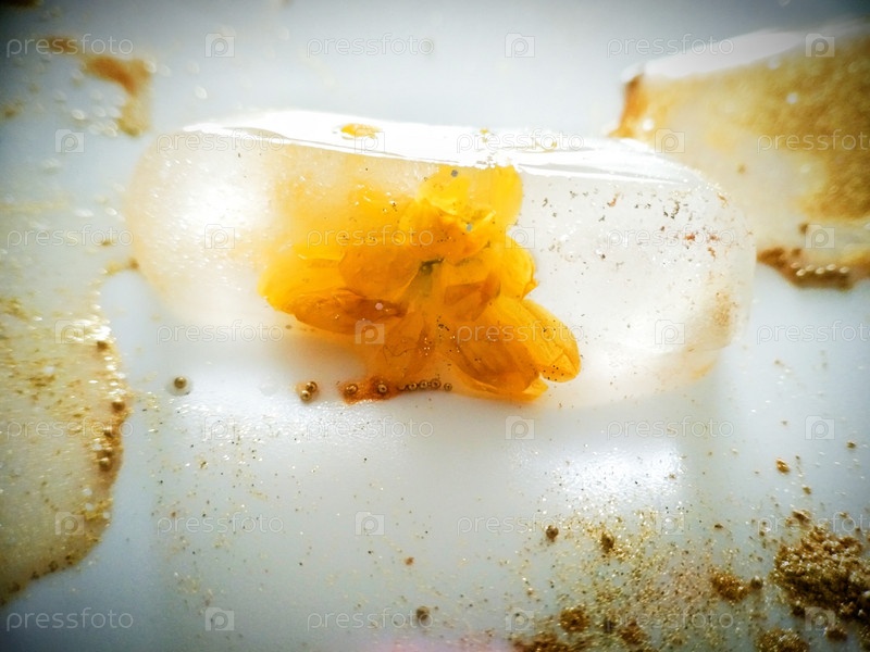 Макросъемка желтого бутона садового цветка во льду с золотистыми бусинками на белом фоне