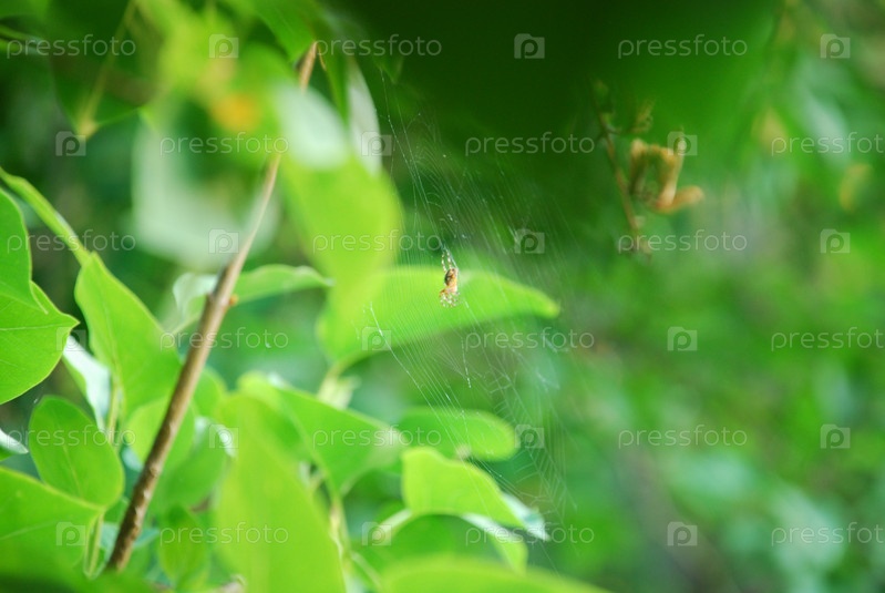 Паутина и паук среди зеленых листьев сирени