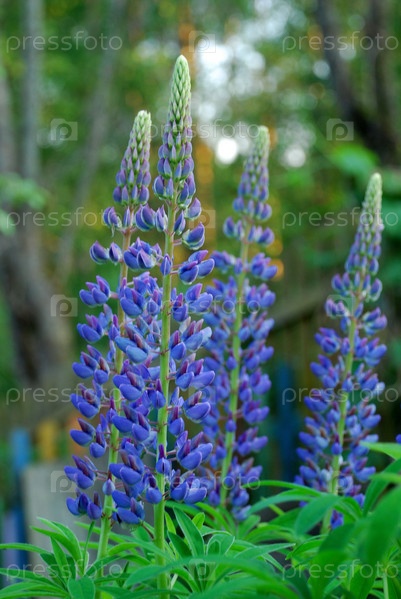 Несколько цветов люпина на фоне природы. Люпин – цветок волка. На длинных зеленых стеблях, окружающих их по кругу, растет множество крупных сине-фиолетовых соцветий, похожих на сердечки