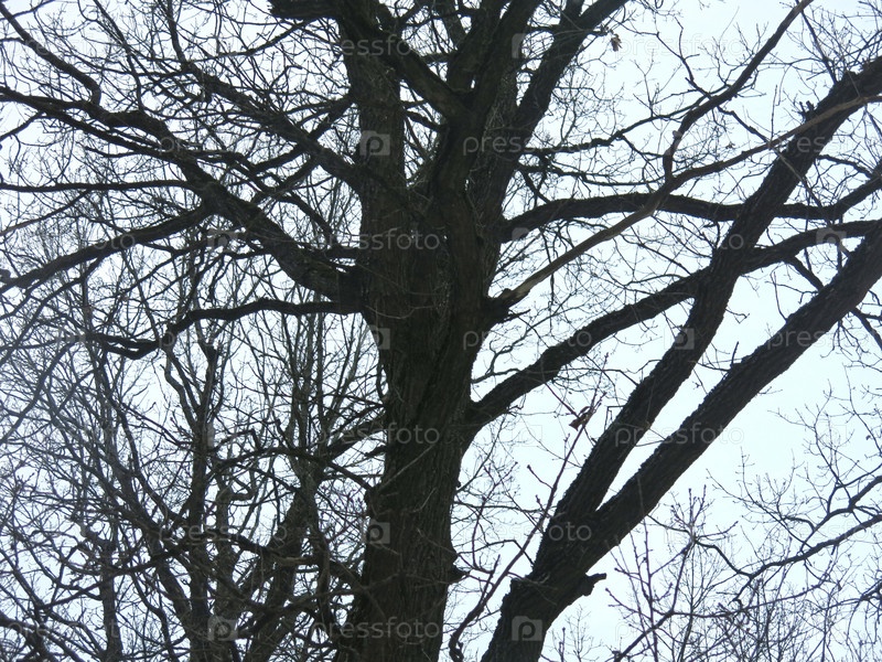Силуэт столетнего дуба без листьев чернеет на фоне хмурого весеннего неба