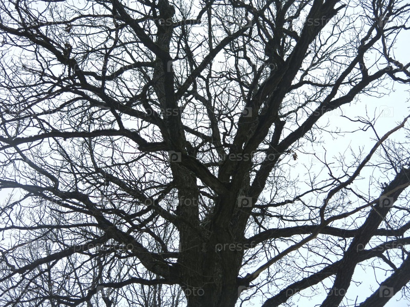 Силуэт столетнего дуба без листьев чернеет на фоне хмурого весеннего неба