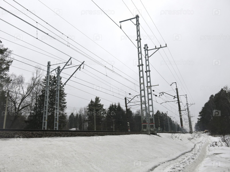Железнодорожная инфраструктура подмосковной станции с опорами, мачтами и столбами на фоне весеннего хмурого неба