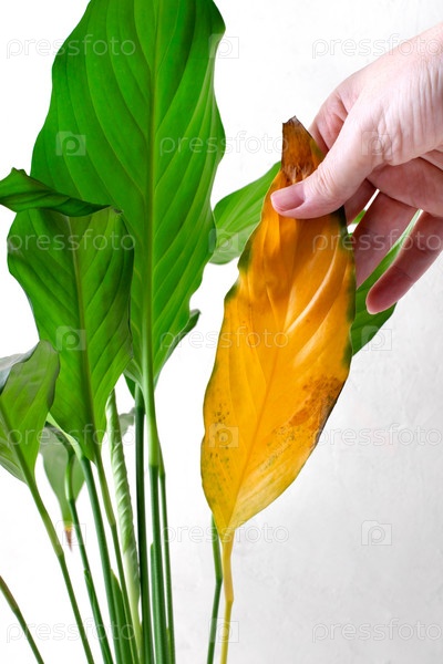 Растение спатифиллум с желтыми листьями. Неправильный уход за комнатным растением в горшке. Вредители, переувлажнение, корневая гниль или возраст
