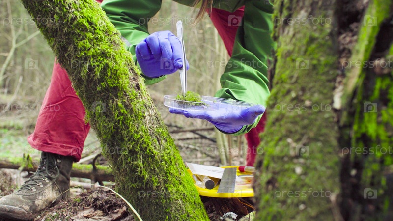 Ученый-эколог в лесу берет образцы растений