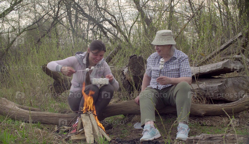 Пожилые и молодые женщины сидят у костра