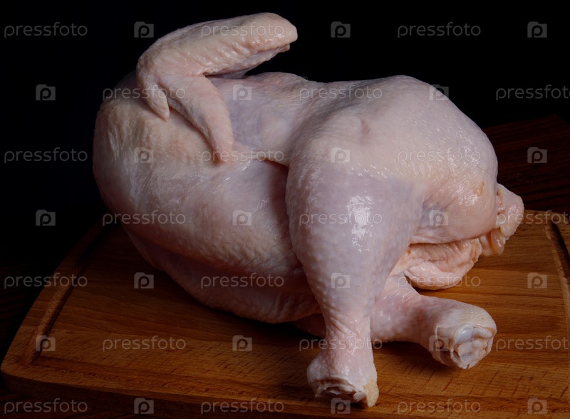 Цыпленок-бройлер лежит на деревянной разделочной доске