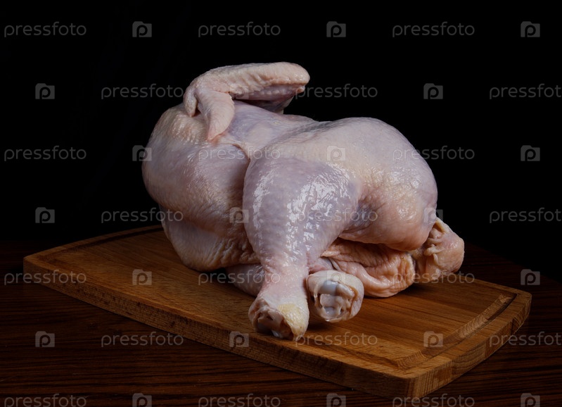 Цыпленок-бройлер лежит на деревянной разделочной доске