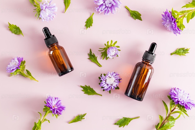 Две стеклянные бутылки-капельницы для косметического использования и фиолетовые цветы на фиолетовом фоне. профилактика возрастных изменений кожи. вид сверху