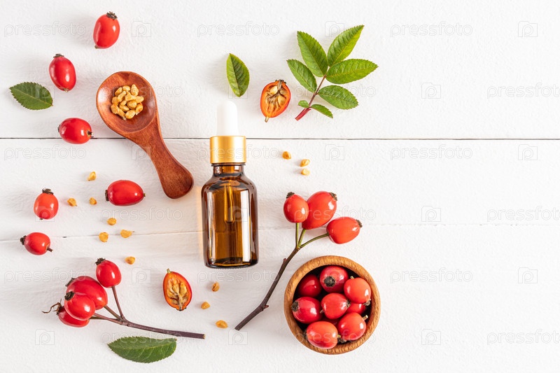 Косметическая бутылка с пипеткой с органическим маслом семян шиповника на белом деревянном фоне. ложка с семечками и миска с фруктами. вид сверху