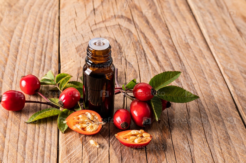 Стеклянная медицинская бутылка с капельницей эфирного масоа или эссенции семян шиповника со свежими фруктами на деревянном фоне. спа. ароматерапия