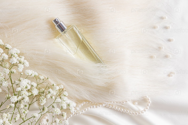 Элегантный флакон женских духов утопает в куче бежевого меха. жемчужные бусины и цветы гипсофилы. дорогой аромат. вид сверху
