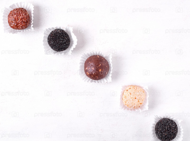 Ассорти веганских сырых сладостей с орехами, семенами и сухофруктами в бумажных стаканчиках на белом. Конфеты ручной работы без сахара, расположенные по диагонали. Вид сверху