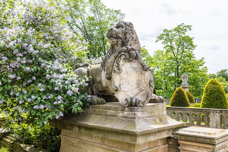 Каменная статуя льва с гербом возле замка Ксенж. Валбжих, Польша, 20 мая 2022 г