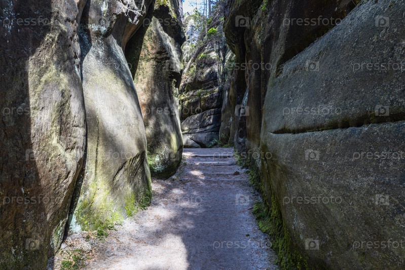 Туристическая тропа между скальными башнями и стенами в скалах Адршпах, Чешская Республика