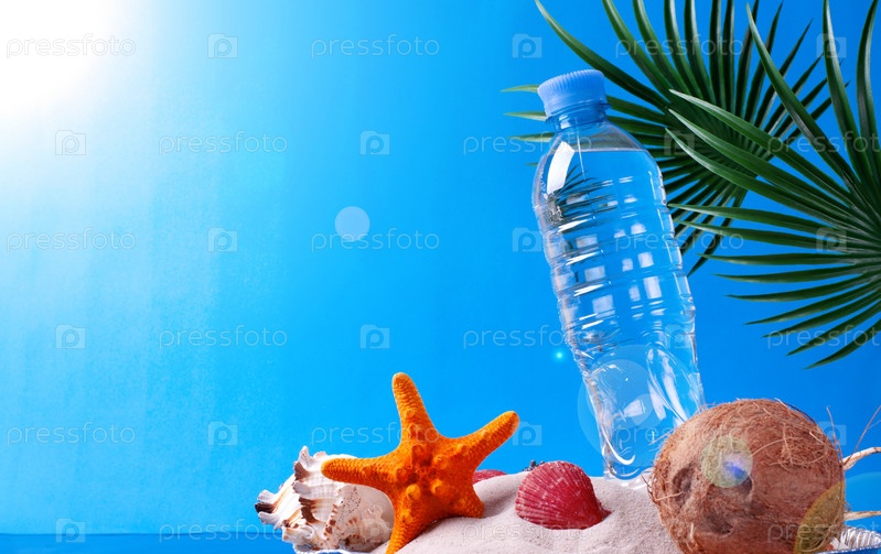 Бутылка с водой, кокос, морская звезда и ракушки в песке на синем фоне. Поддержание водного баланса на пляже. Концепция пластиковых отходов