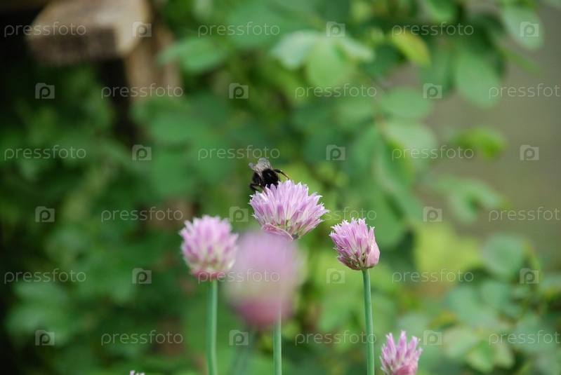 Шмель собирает нектар на фиолетовых цветках