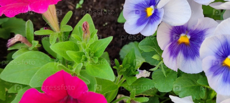 Цветы анютины глазки расцвели на клумбе