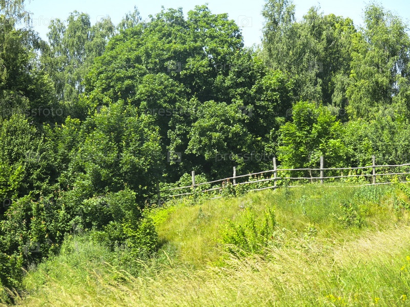 Живописный обрыв над рекой летом с деревянным сельским забором