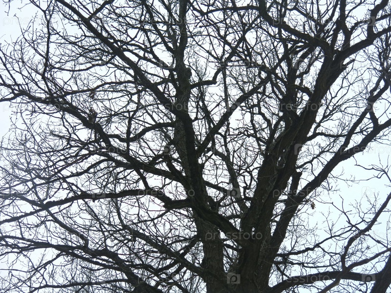 Силуэт столетнего дуба без листьев чернеет на фоне хмурого весеннего неба