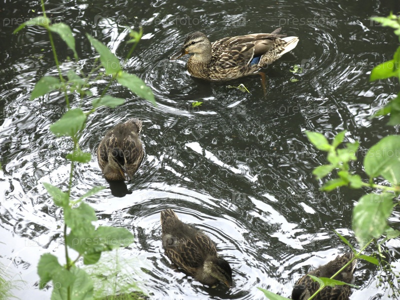 Утки плавают весной в канаве вместе с утятами