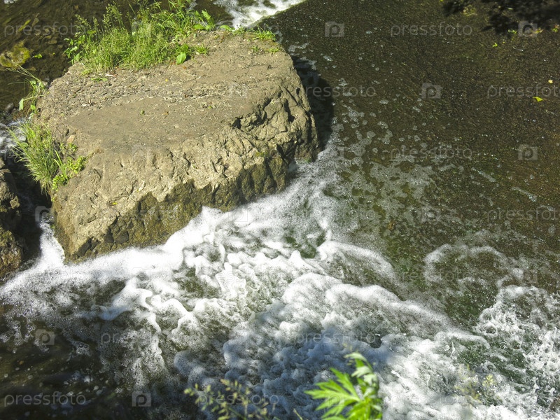 Речная вода бьется о камень и бурлит белой пеной
