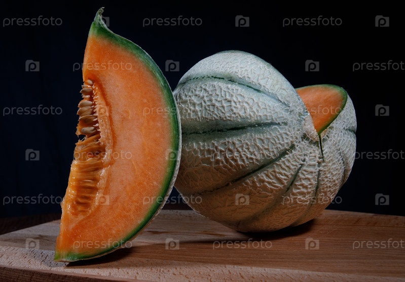 Спелая вкусная дыня на деревянной доске. Красивая сочная дыня