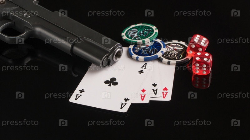 Угловой снимок оружия рядом с игральными картами и костями на черной отражающей поверхности