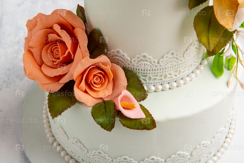Крупный план розовых цветов на белом торте