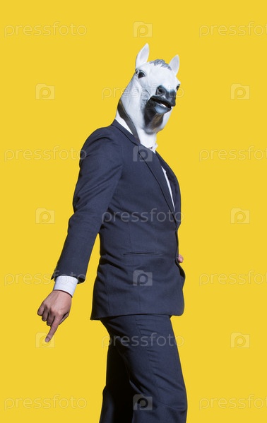 Вертикальный снимок творческого человека в костюме с маской белой лошади, позирующего на желтой стене