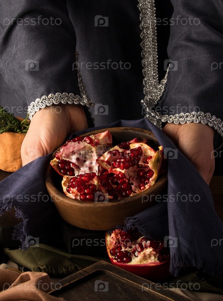 Вертикальное фото женских рук, держащих чашу граната
